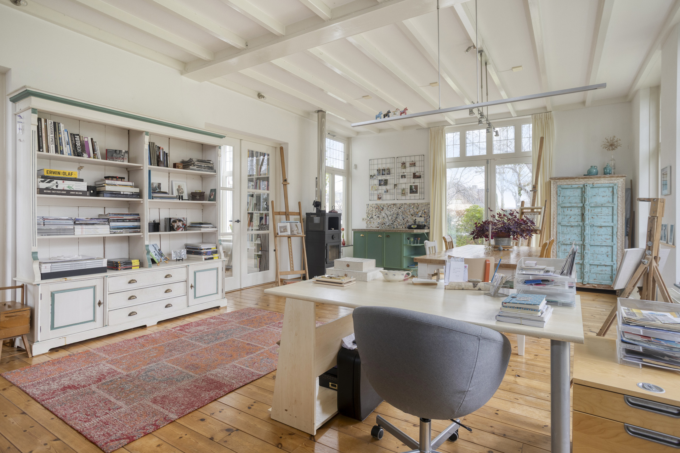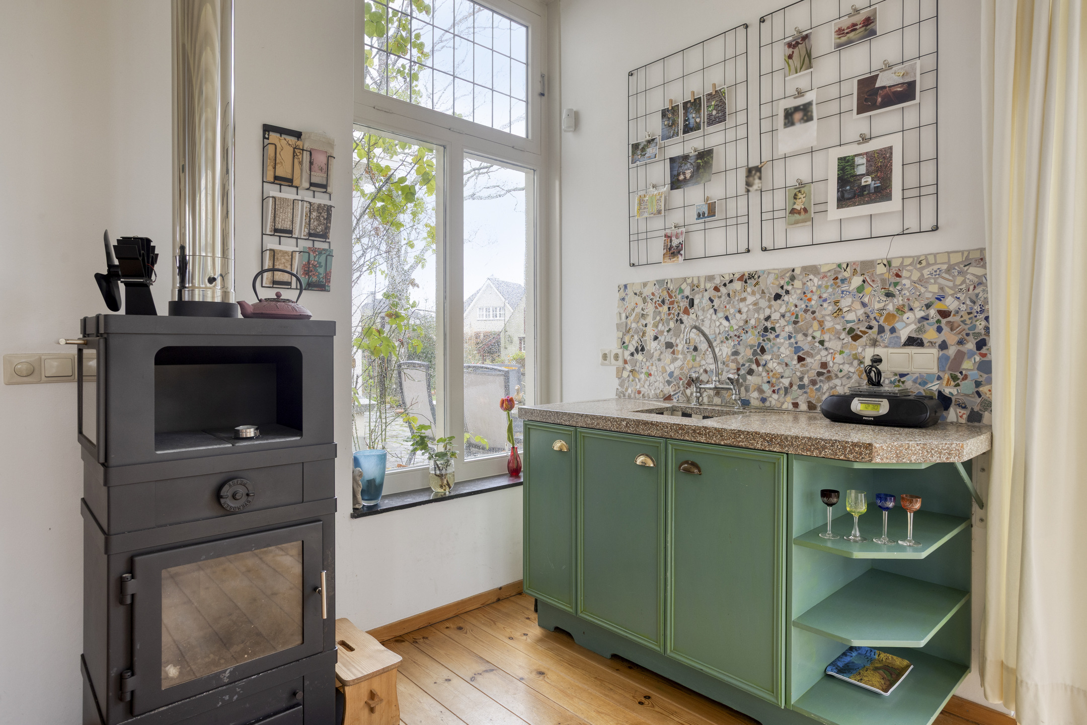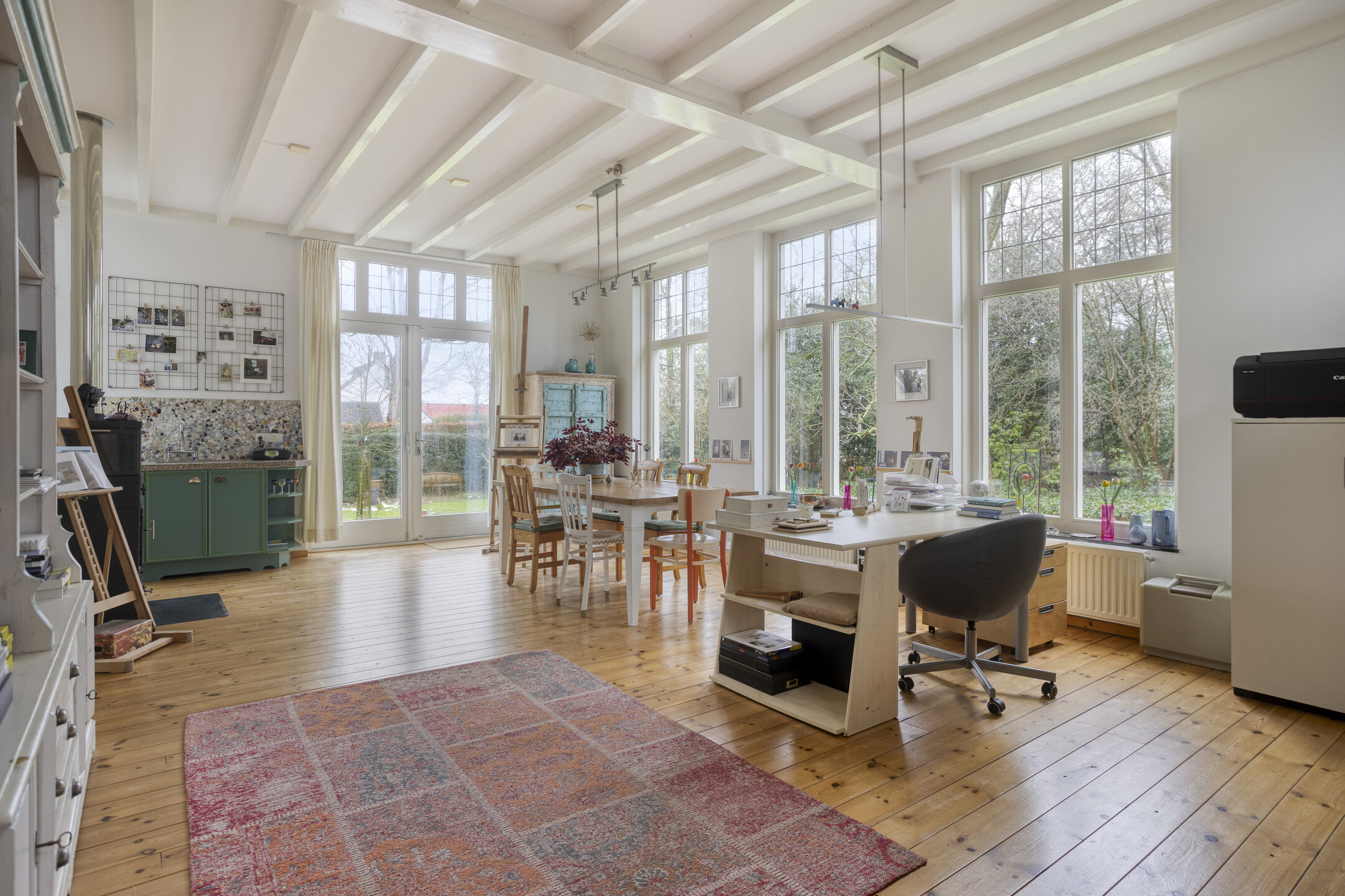De zitkamer is groot en voelt bijna als een lichte tuinkamer. Door ramen aan vier kanten kijk je overal de tuin in en heb je steeds een ander uitzicht. Hier merk je pas echt hoeveel licht deze woning heeft. De houten balken en mooie ramen geven deze ruimte veel charme. Er staat een klein keukenblok met stenen blad en een extra gootsteen, handig als je graag schildert of creatief bezig bent. De ruimte is voorzien van een aansluiting voor een hout- of pelletkachel.