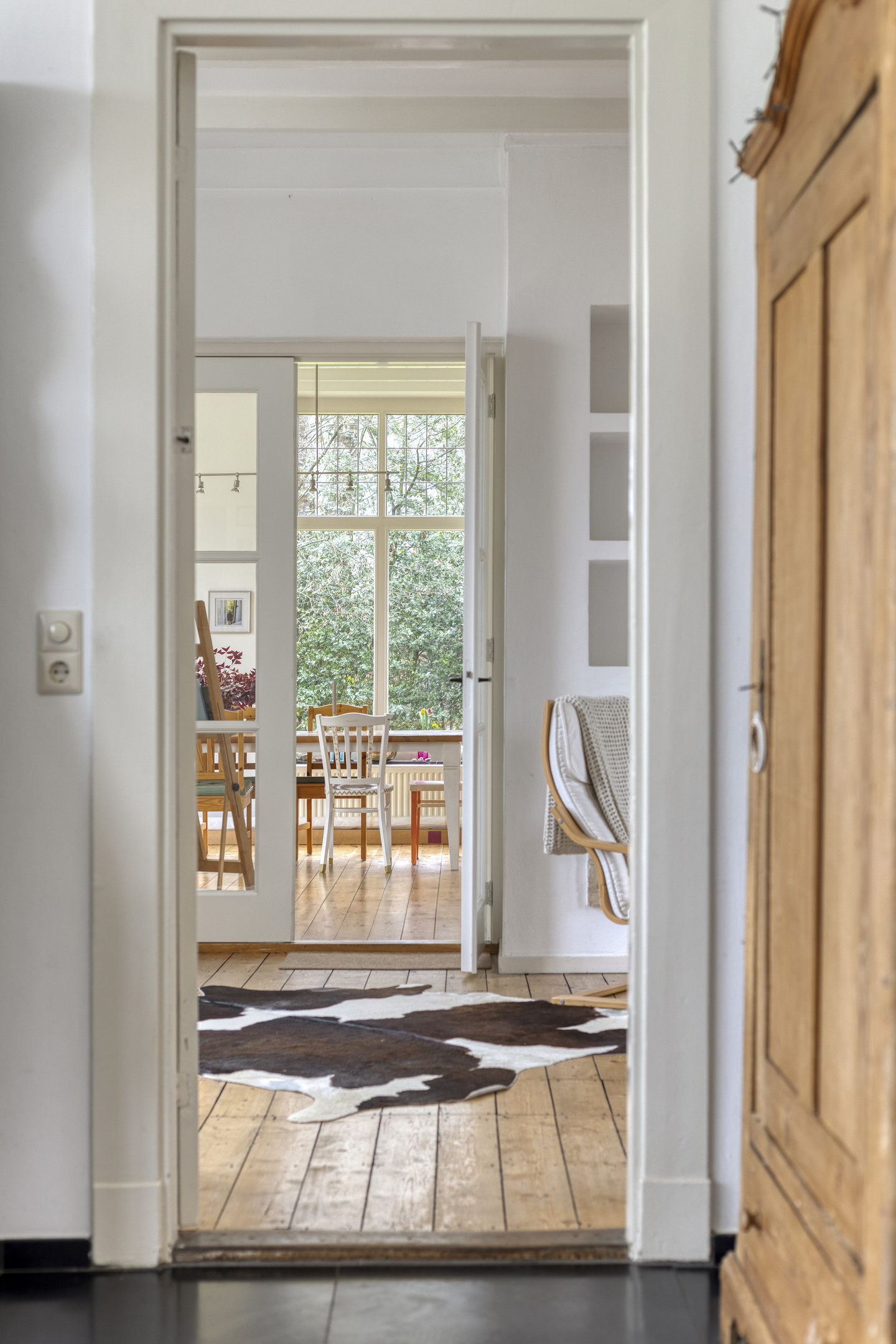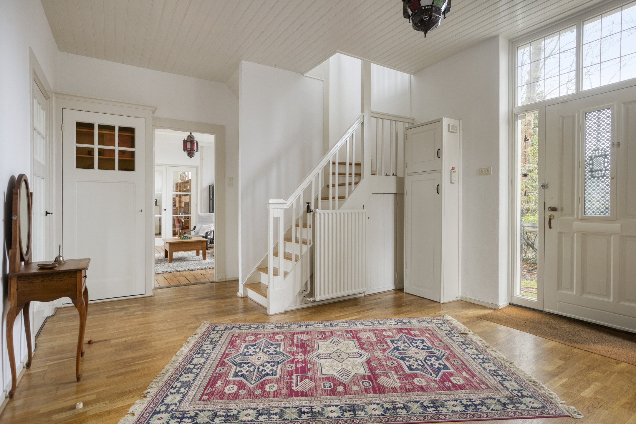 Je komt binnen in een ruime hal waar direct opvalt hoe licht en open het hier is. De hoge plafonds geven extra ruimte en de houten plankenvloer zorgt voor een warme uitstraling. Vanuit de hal loop je makkelijk door naar de woonkamer, keuken en eetkamer. Ook het toilet en de trap naar boven vind je hier. De inbouwkast is ideaal voor schoenen en alles wat je netjes uit het zicht wilt houden.