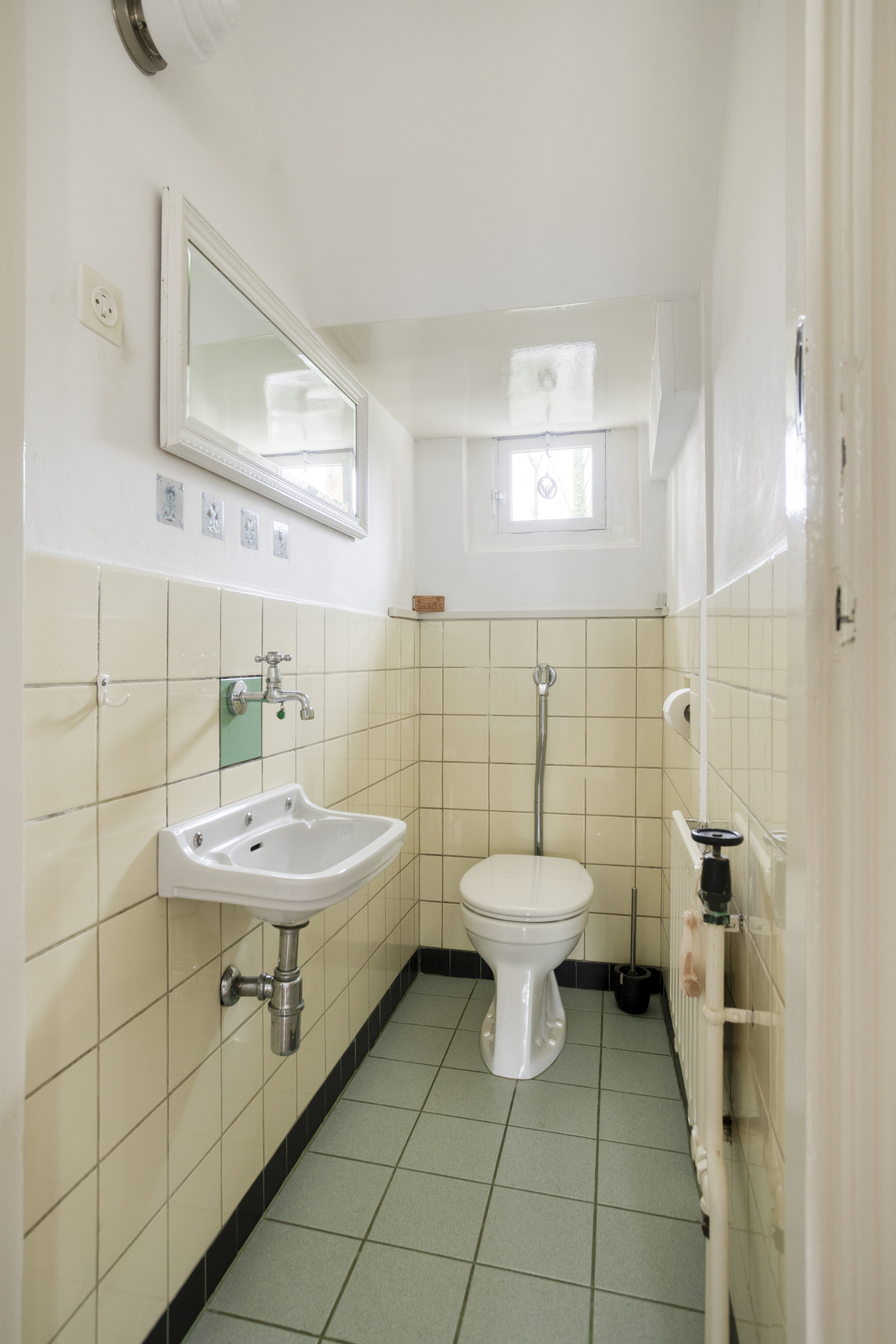 Het toilet is netjes afgewerkt met een inbouwcloset, een fonteintje en een radiator. Het raam zorgt voor frisse lucht en prettig daglicht. De wanden zijn halfhoog betegeld.