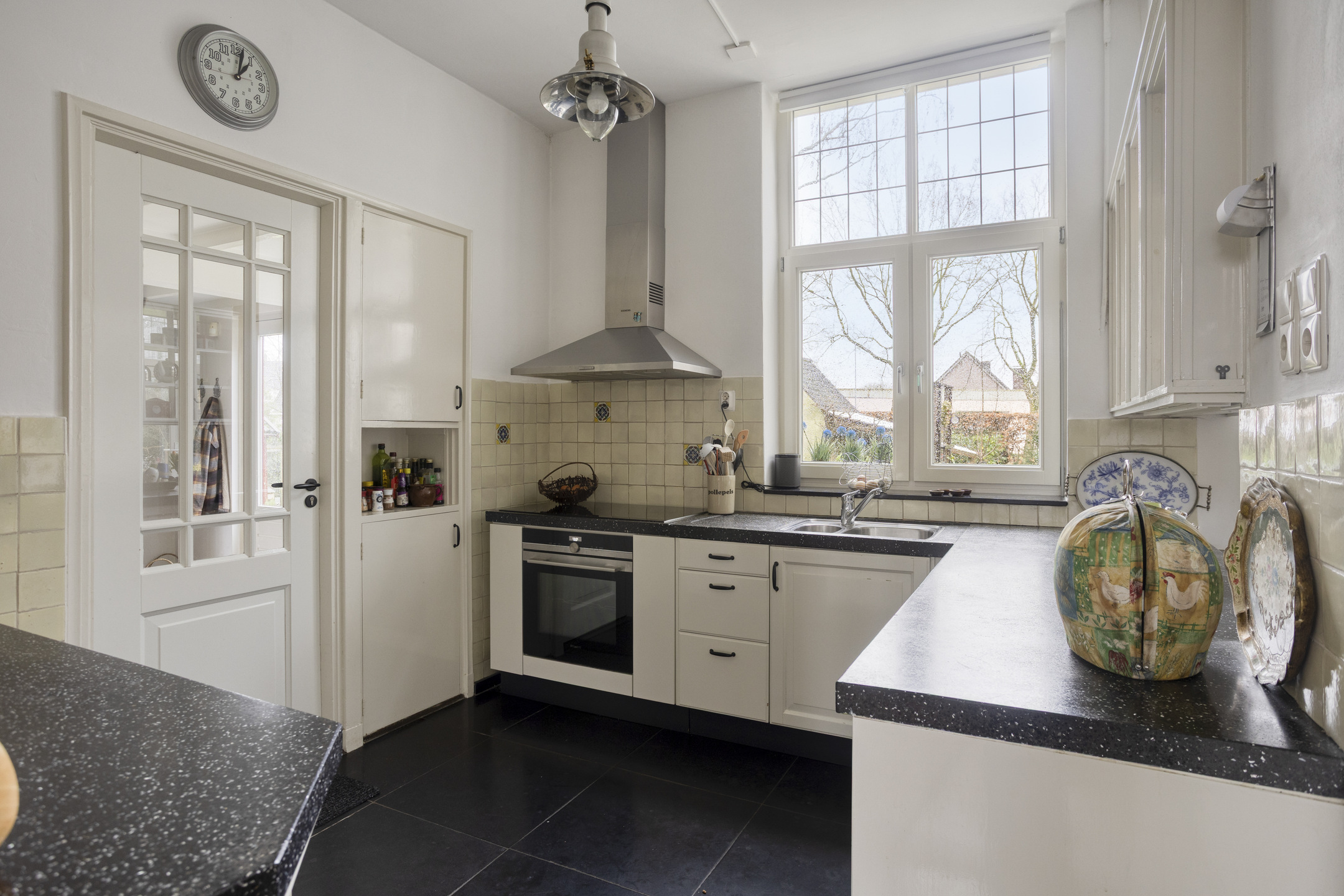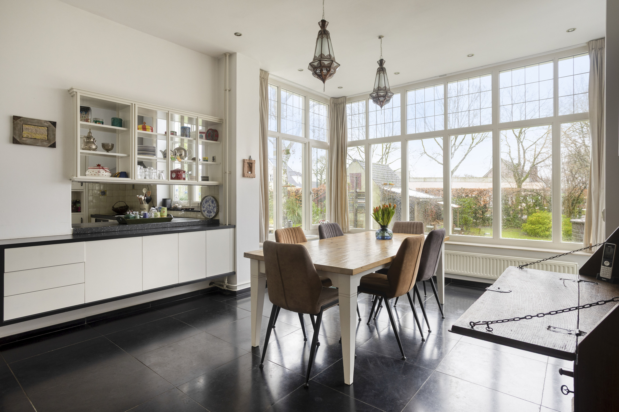 Keuken met gezellige zithoek en zicht op de achtertuin