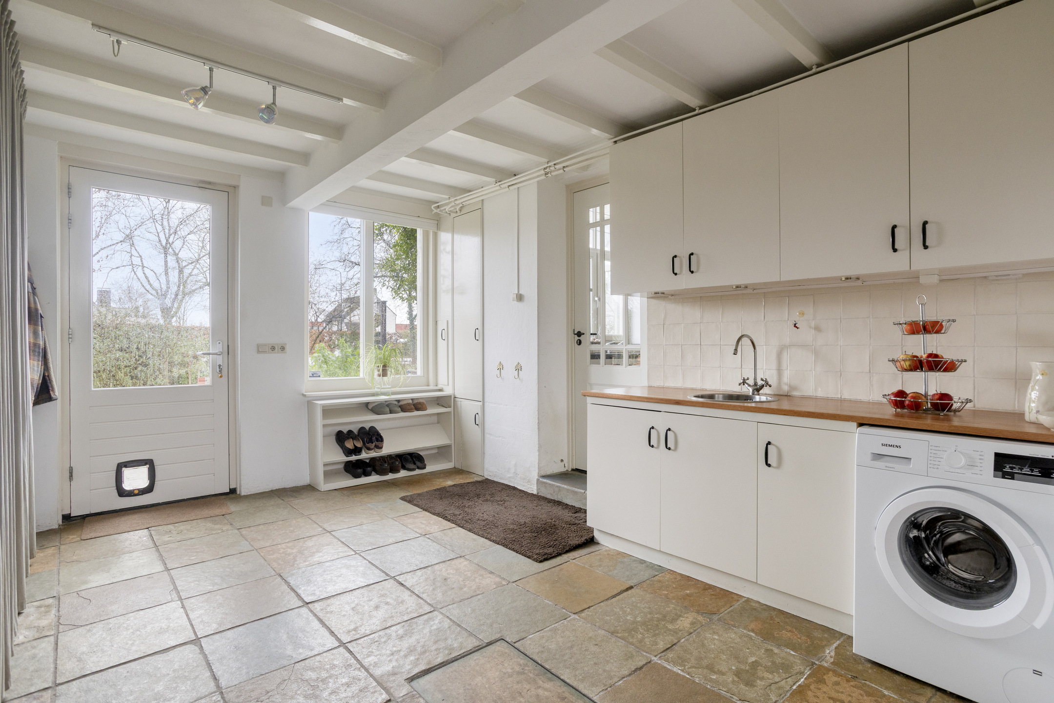 Ruime bijkeuken met extra keukenblok en toegang tot de tuin