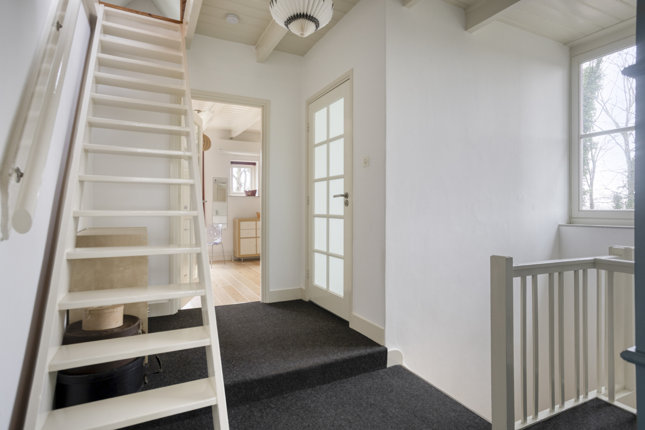 Via de vaste trap kom je op de overloop. Hier heb je toegang tot drie slaapkamers en twee badkamers. De vloer is afgewerkt met vloerbedekking en er is een vaste trap naar zolder. Op de overloop is genoeg plek voor een linnenkast of extra opbergruimte.