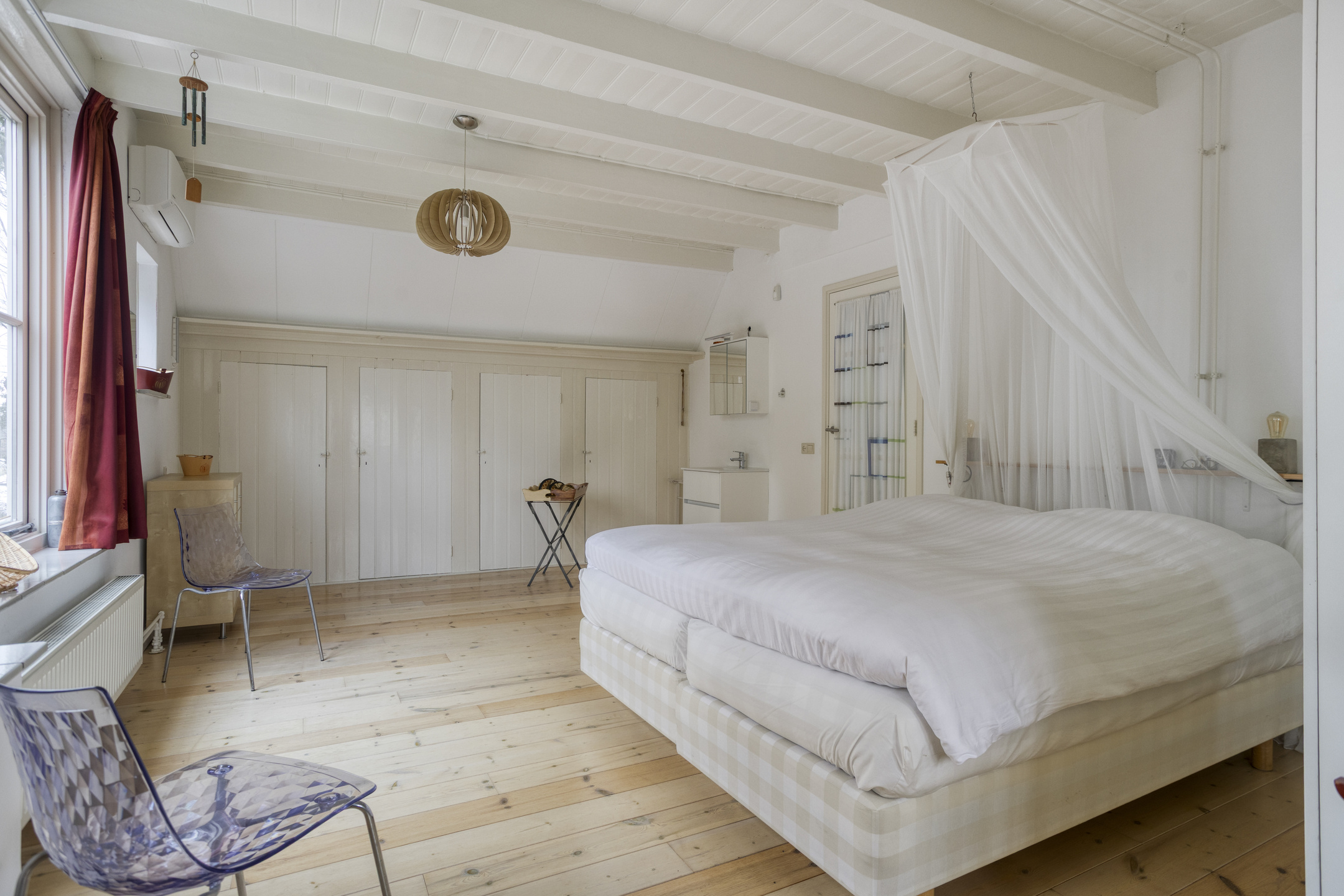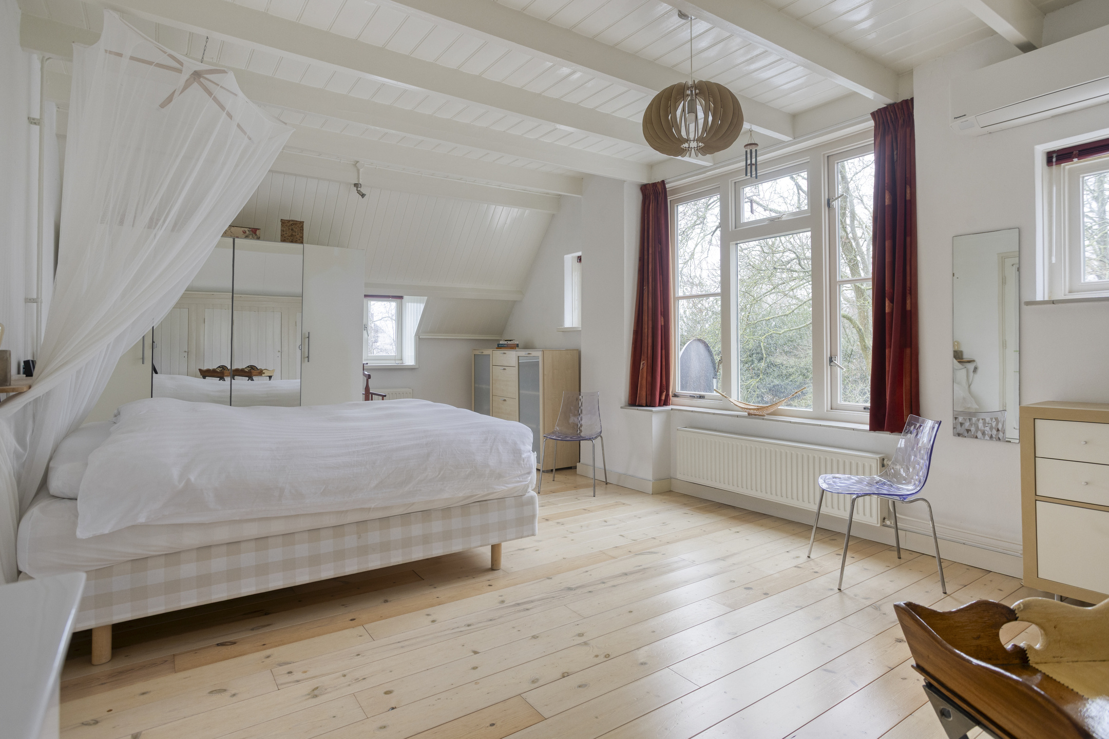 De grootste slaapkamer ligt aan de rechterzijde en strekt zich uit over de volle breedte van de woning. Door de vele ramen is het hier licht en ruim. De inbouwkasten zorgen voor veel opbergruimte en de Panasonic airco maakt het comfortabel slapen, ook in de zomer.