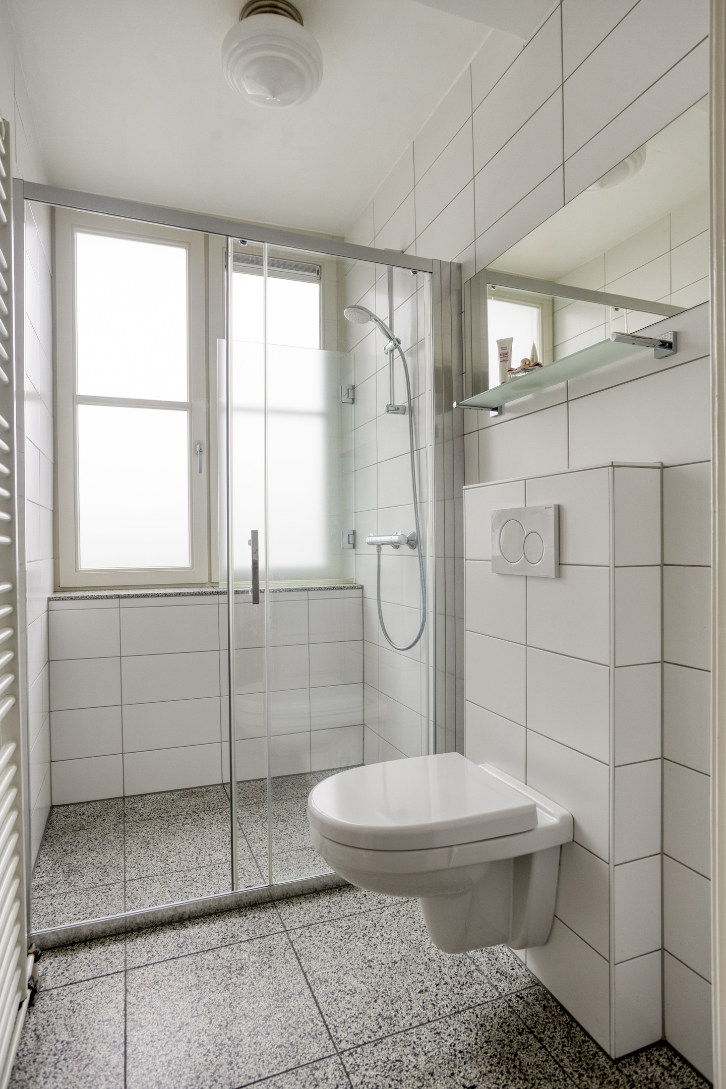 De tweede badkamer is strak en volledig betegeld. Ook hier zijn ramen aanwezig voor ventilatie. De ruimte is ingericht met een inloopdouche, een wandcloset en een handdoekradiator. Extra fijn met meerdere slaapkamers op dezelfde verdieping.