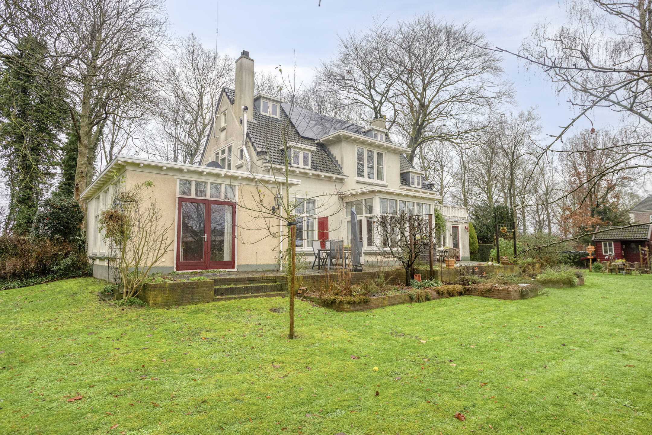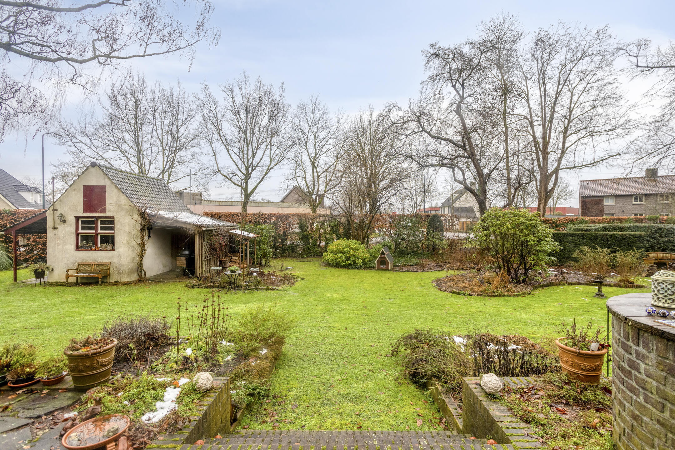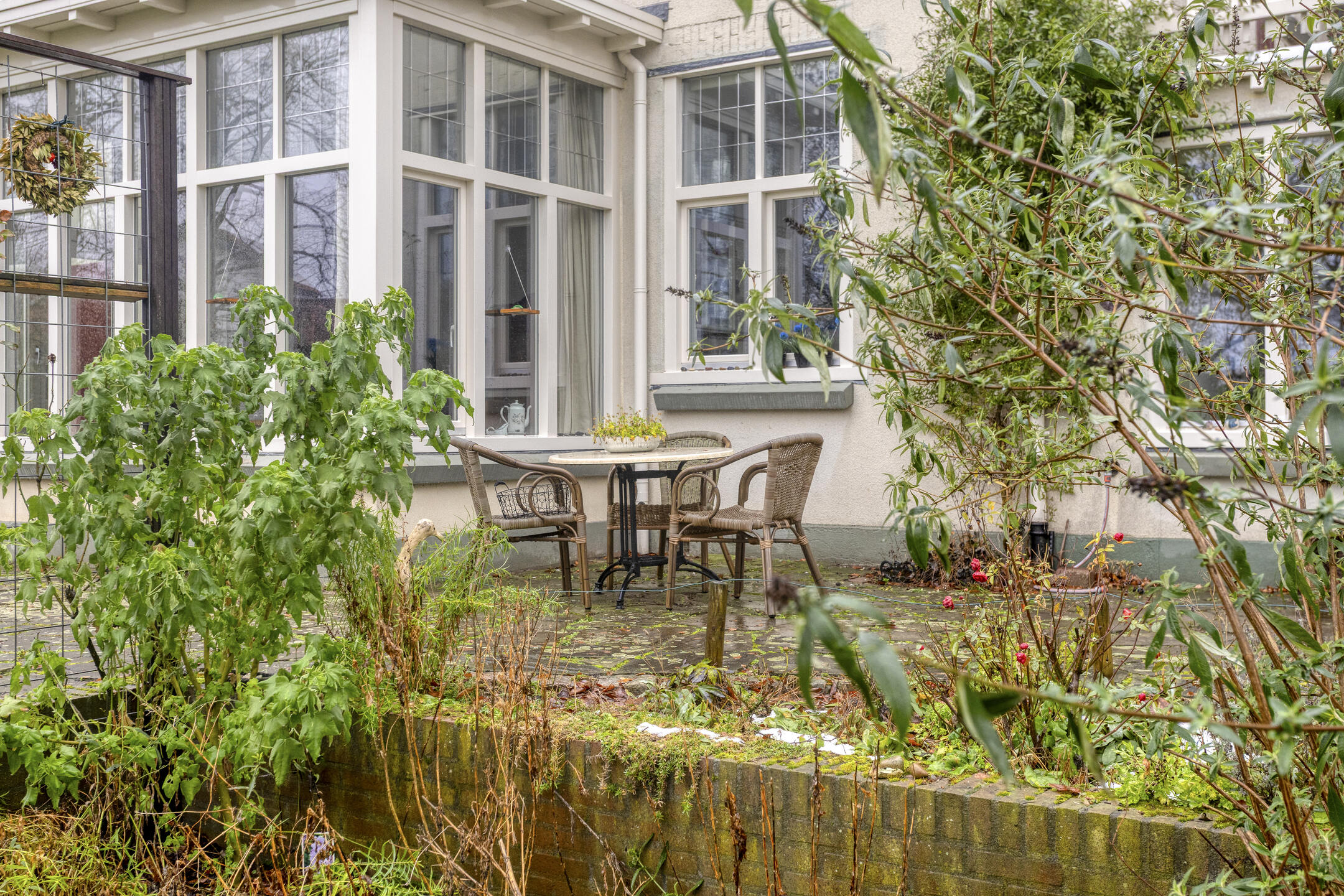 De achtertuin is ruim en groen, met volwassen beplanting die zorgt voor privacy en een rustige sfeer. Door de verhoging aan de woning zijn er meerdere fijne plekken om te zitten. Er is ruimte genoeg om je eigen groente te verbouwen en het kippenhok maakt het helemaal af voor wie graag buiten leeft. Achter in de tuin bevindt zich een berging en een tweede poort. Aan de achterzijde loopt een pad, waardoor je rond kunt lopen door de hele tuin. Dit is zo’n plek waar je na een lange dag graag nog even buiten zit.